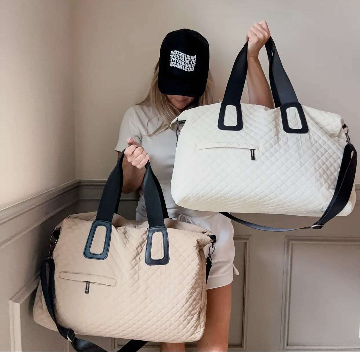 The quilted weekender in off white or beige is perfect travel companion. Its durable water-resistant outer and quilted design add a touch of luxury to your journey. With a front zipper pocket, top zipper closure, and detachable adjustable shoulder strap, this bag is both functional and stylish.